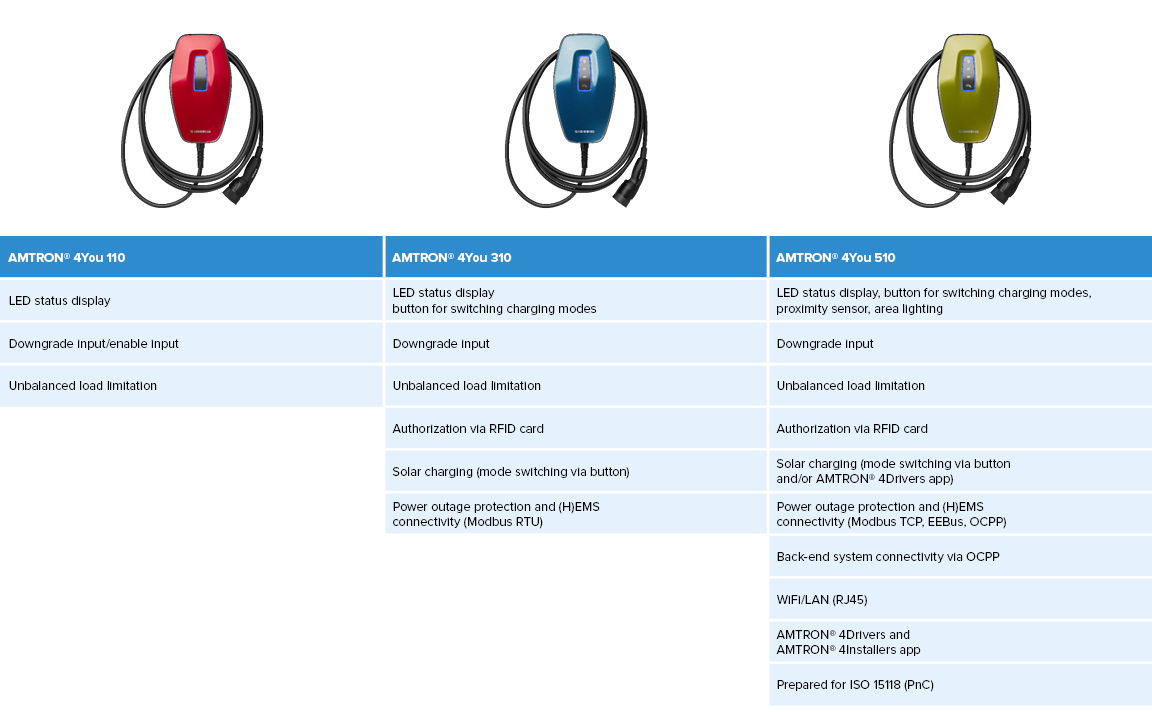 The AMTRON® family covers all possibilities of charging at home. An overview of the most important functions of the different variants is given here: