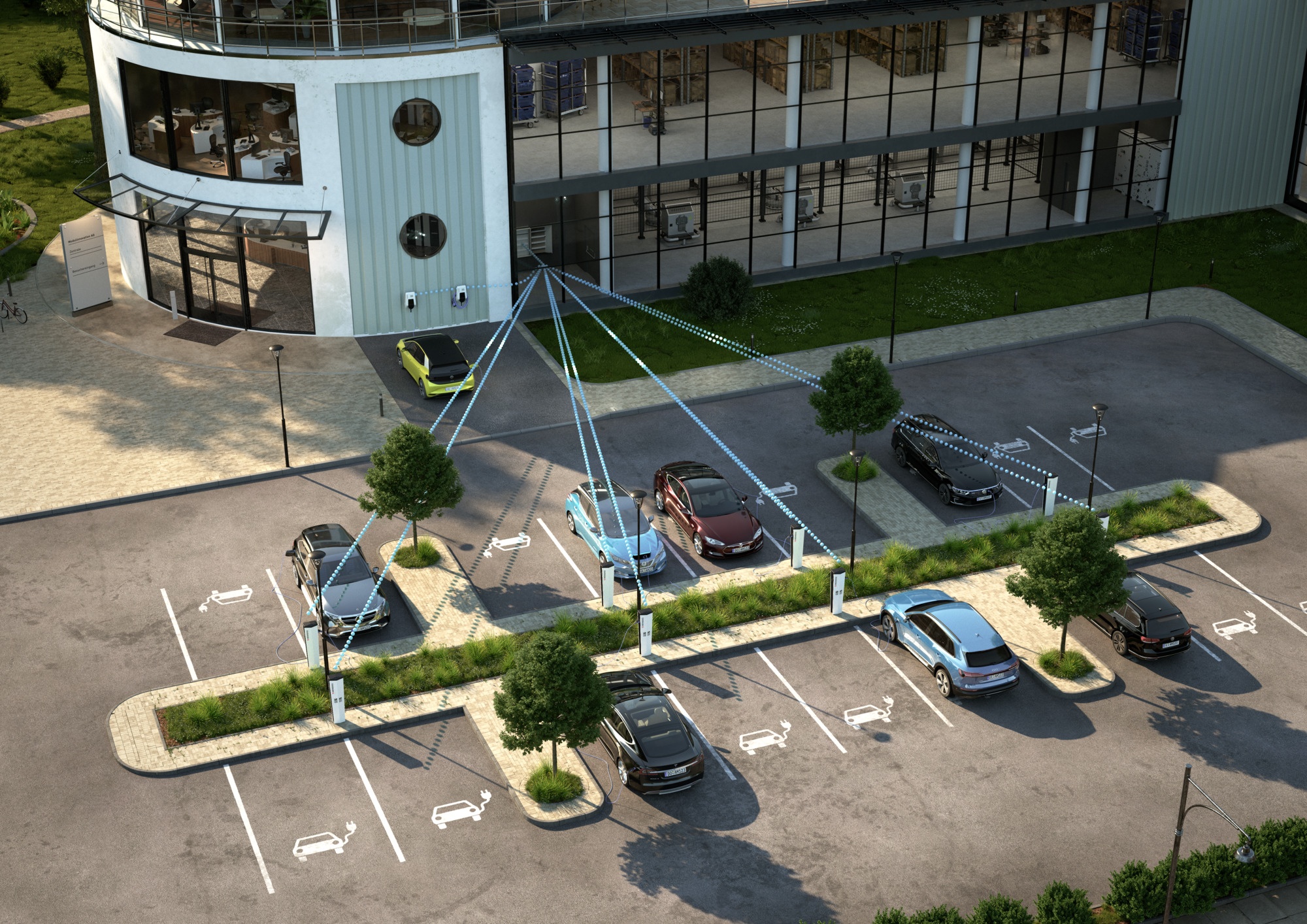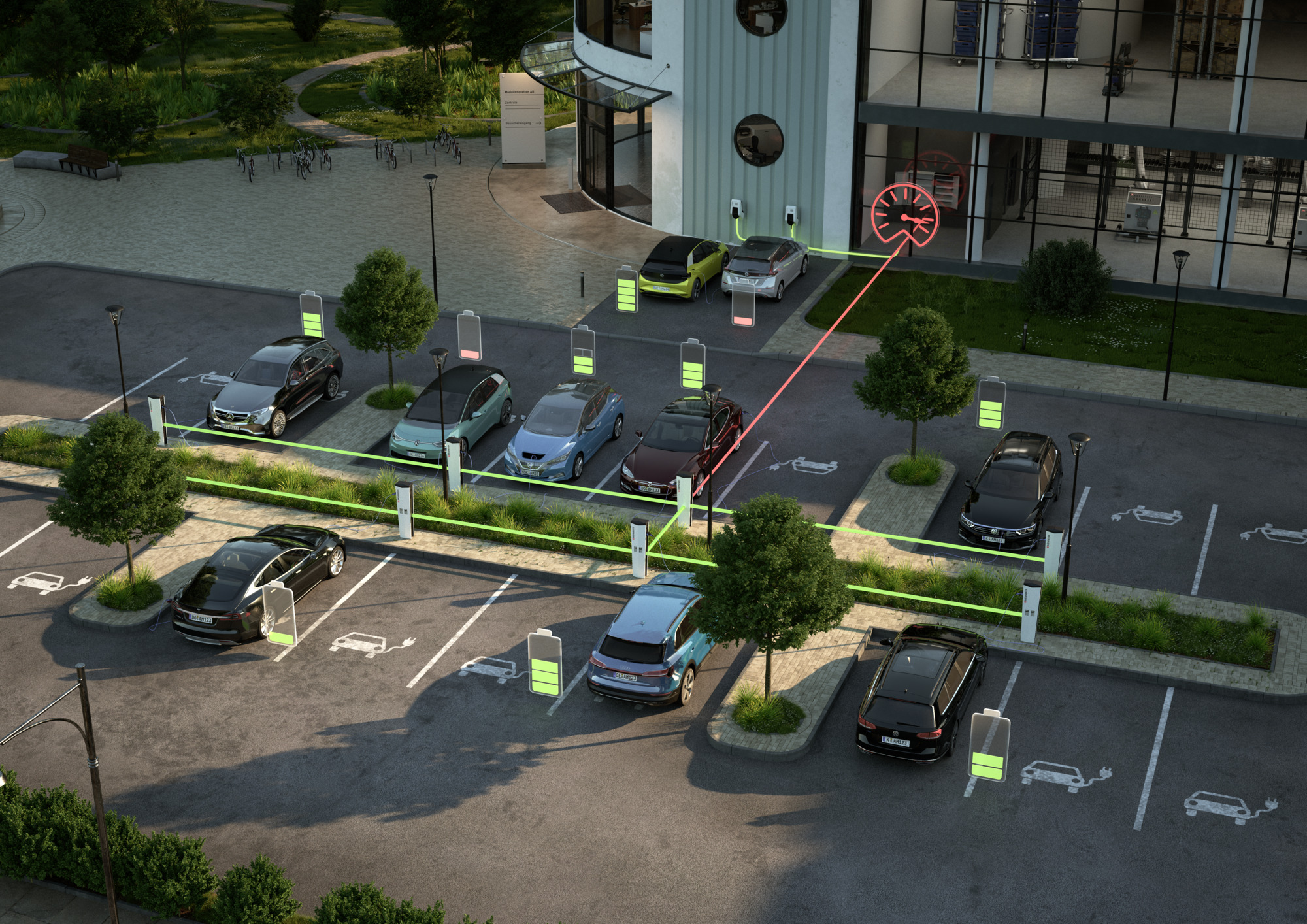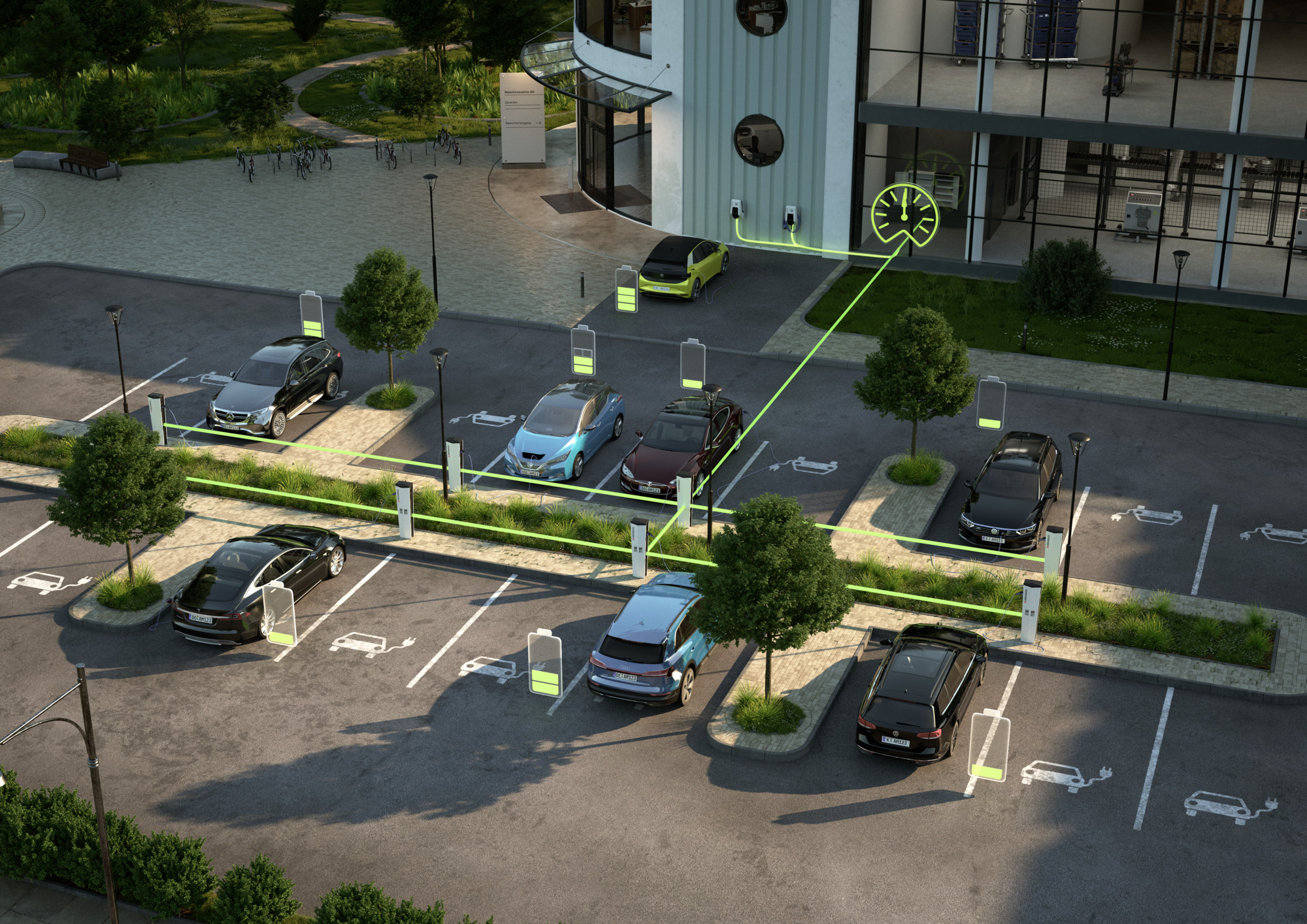 The charging infrastructure is integrated into the property's energy management system (EMS) using established interfaces and protocols. Compatibility and interoperability is provided with many EMS manufacturers. Phase-accurate load management includes configurable unbalanced load avoidance.